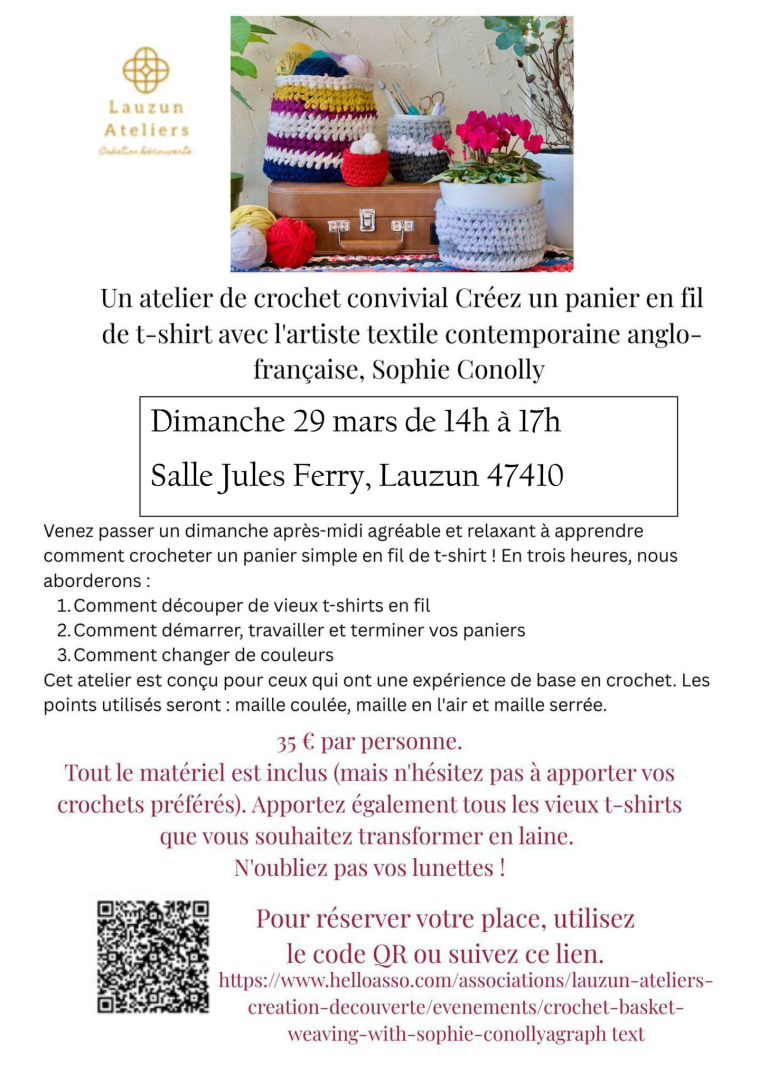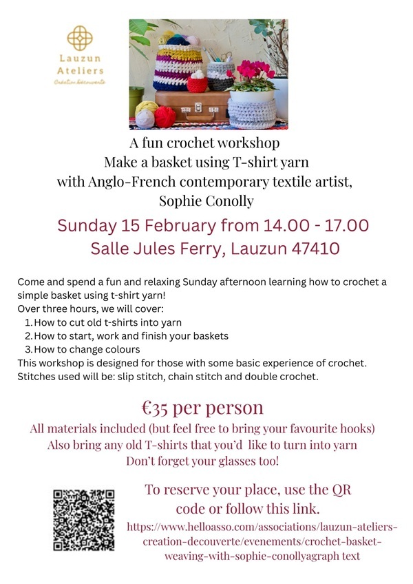 Réservations - https://www.helloasso.com/associations/lauzun-ateliers-creation-decouverte/evenements/crochet-basket-weaving-with-sophie-conolly