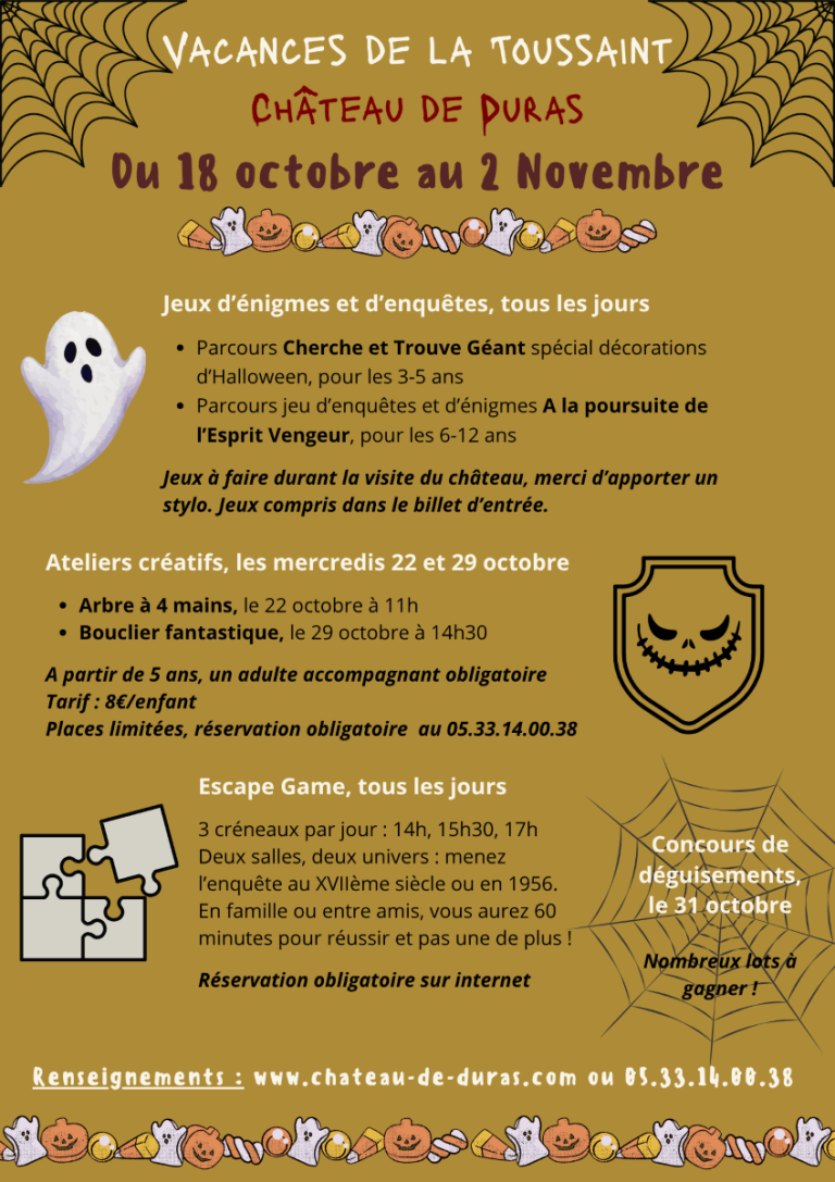 -Pour les 6-12 ans : parcours d'enquête « A la poursuite de l'Esprit Vengeur ». Pénétrez dans le château, avancez de salle en salle, regardez dans les moindres recoins.. Découvrez qui hante le château, pour quelle raison et comment libérer les lieux de son emprise.
