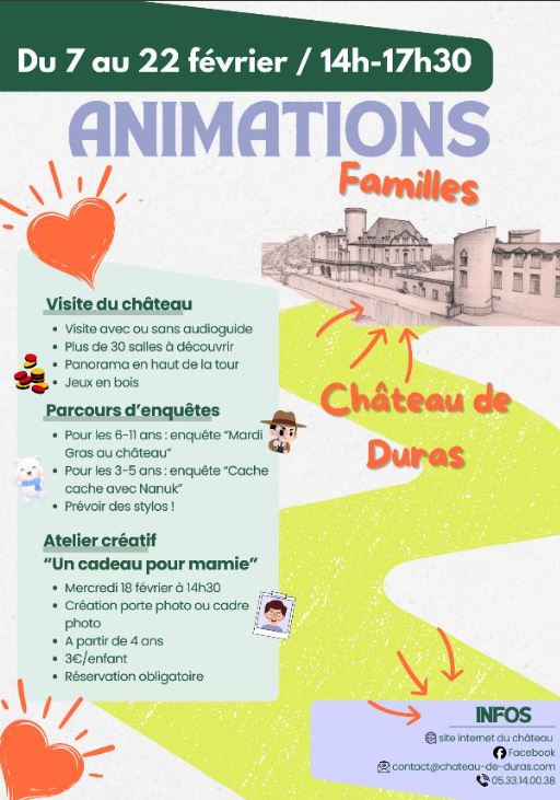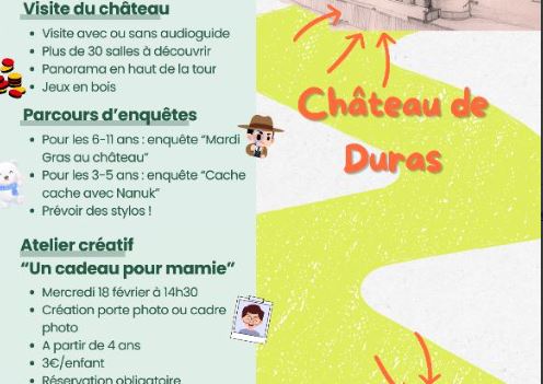 Le mercredi 18 février à 14h30 au chateau de duras, atelier créatif "un cadeau pour mamie", création porte photo ou cadre photo. A partir de 4 ans. Réservation obligatoire.