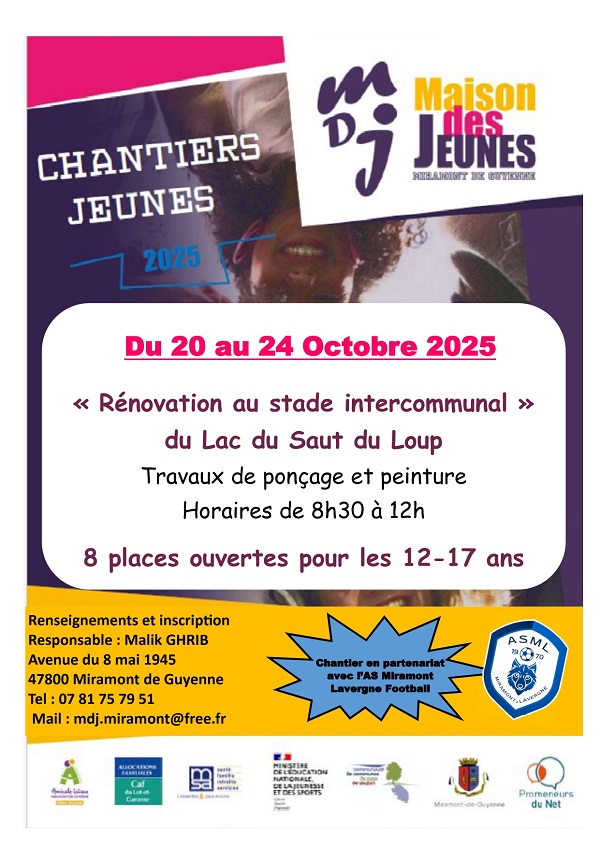 La Maison des Jeunes propose un chantier jeunes de 12 à 17 ans. Le thème est rénovation au stade intercommunal du lac du Saut du Loup. Travaux de ponçage et peinture. 8 places de disponibles. Sur inscription. Transport possible depuis le MDJ.