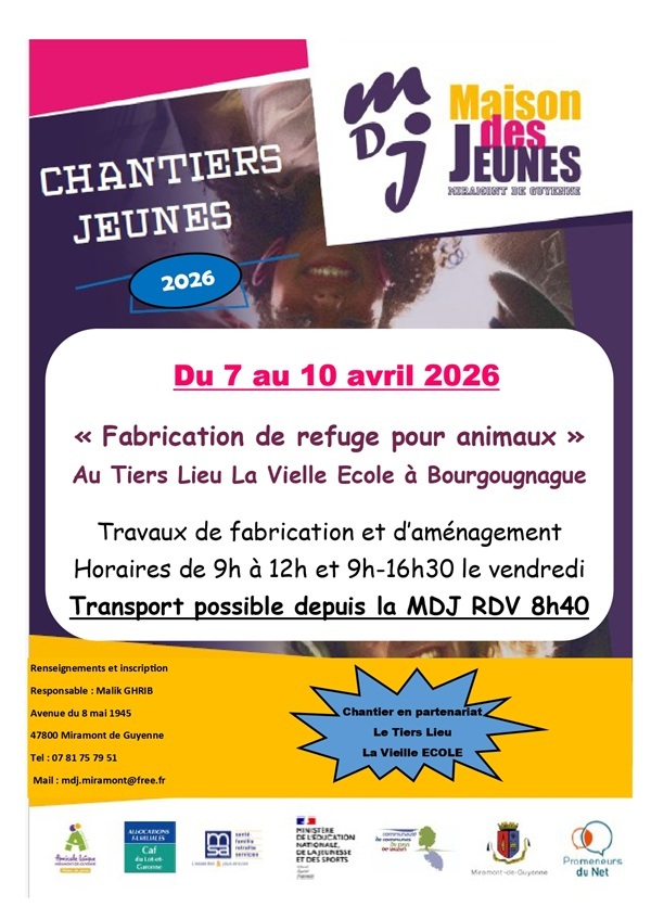 La Maison des Jeunes propose un chantier jeunes. Le thème est fabrication de refuge pour les animaux, au tiers lieux de la vieille école à Bourgougnague. Transport possible depuis la maison des jeunes rendez-vous à 8h40.