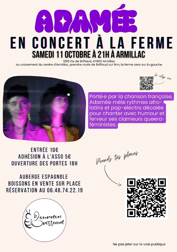 L'association Bourdon Briffaud vous propose un concert du groupe Adamée. Venez profiter de ce moment précédé d'un repas de type auberge espagnole. "Adamée" est une entité polymorphe à la croisée des voix et des formes. Puisant son inspiration dans les cris des sorcières épargnées ou oubliées, le groupe fait circuler son message en constante évolution et met en exergue un quotidien parfois absurde, mais bien réel. Constitué de Lisa et Margo, "Adamée" façonne son univers en alliant l'intime au politique à travers des compositions originales. Ces chanteurs·euses instrumentistes fusionnent leur quotidien et leurs revendications à leur humour décalé pour ne faire qu'un seul son : Celui d' "Adamée".