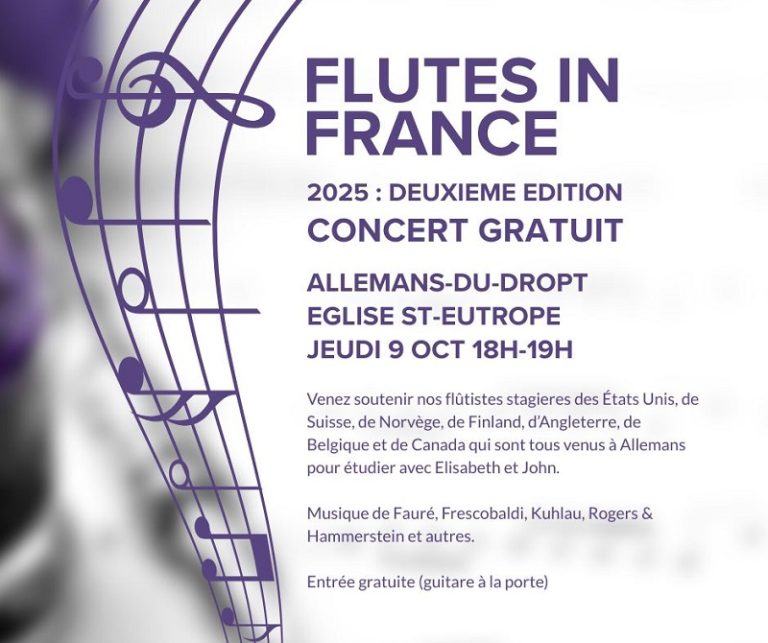 Venez nombreux assister au concert de flûte à l'église organisé par Elisabeth Parry et John Alley. Leurs stagiaires flûtistes de Belgique, du Canada, de Finlande, de Suisse, de Norvège, des États-Unis et d'Angleterre vous interprèteront des musiques de Fauré, Frescobaldi, Kuhlau, Rogers & Hammerstein et bien d'autres.