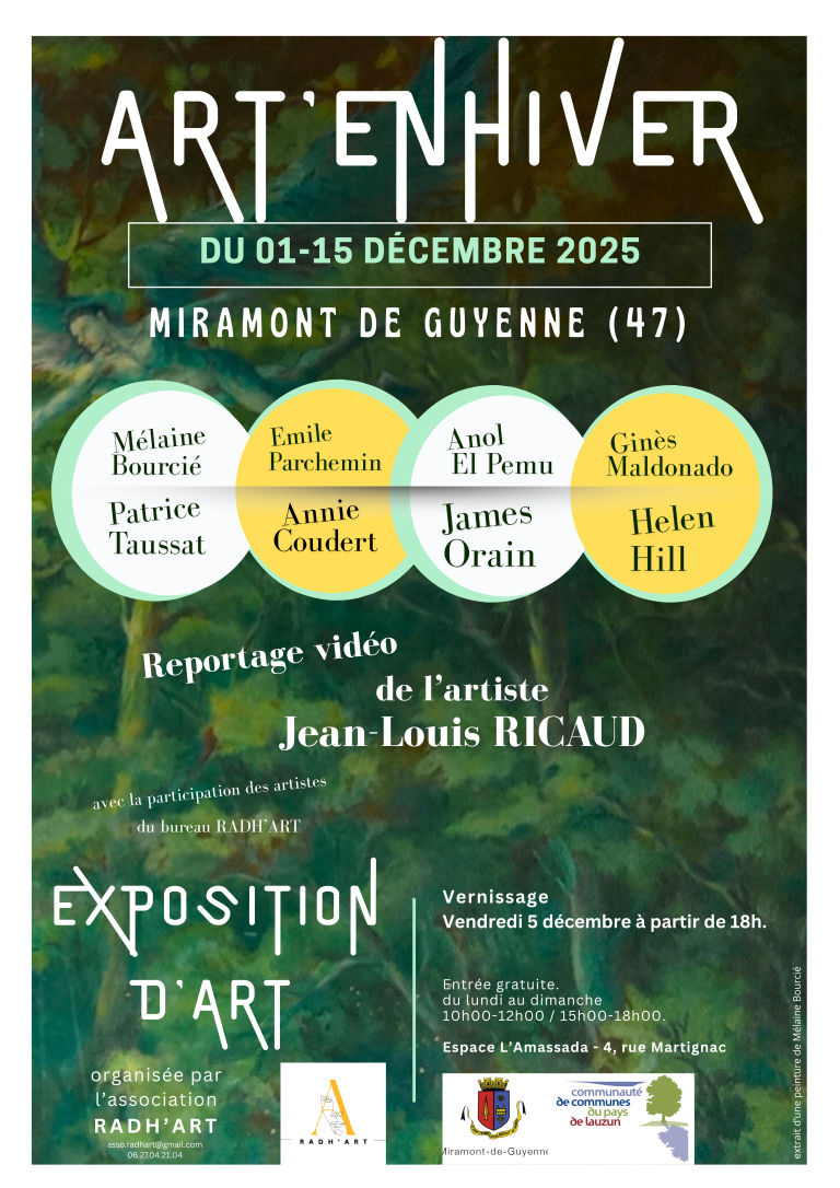 Venez découvrir, durant cette exposition organisée par l'association Radh'art, différents styles artistiques. Vous admirez des œuvres créées par des artistes passionnés, une manière d'ouvrir son esprit à l'Art dans toute sa généralité.