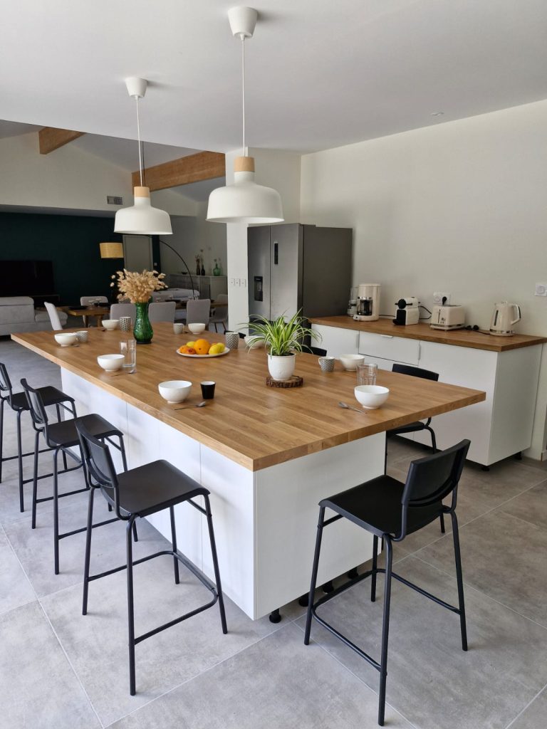 Cuisine équipée avec îlot central ouverte sur le salon et la salle à manger, 3 chambres avec 1 lit double et 1 autre avec 2 lits superposés, salle d'eau avec douche et WC.