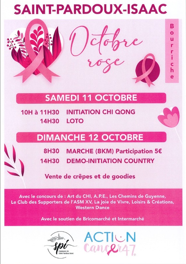 À l'occasion de l'événement "Octobre Rose", venez nombreux aux animations proposées par la municipalité, avec la participation des associations, Action Cancer 47, Art du Chi, APE, Chemins de Guyenne, Club des Supporters de l'ASM XV, La Joie de Vivre, Loisirs et Créations, Western Dance et des magasins Bricomarché et Intermarché. Au programme : initiation Chi Qong et loto, le samedi. Dimanche : marche de 8 km et démo-initiation country. Vente de goodies et de t-shirts sur place pour soutenir l'association Action Cancer 47. La randonnée est suivie par le verre de l'amitié.