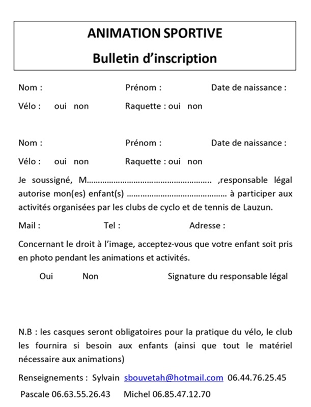Le Cyclo-Club et le Tennis Club de Lauzun offrent une après-midi sportive aux enfants de 6 à 12 ans. Parlez-en autour de vous et venez avec eux ! Vous pouvez venir avec votre matériel sportif (vélo, casque, raquette). Si vous n'en avez pas, ils pourront vous en prêter. Un goûter sera servi à la mi-temps.