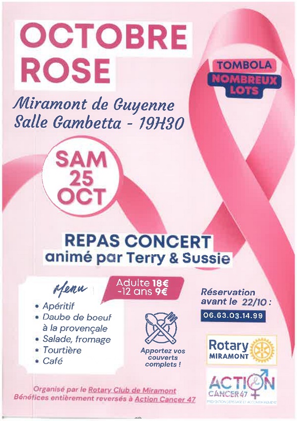 Dans le cadre de l'événement caritatif Octobre Rose, venez nombreux au repas concert organisé par l'association Rotary Club. Il sera animé par le duo Terry & Sussie. Tombola proposée avec de nombreux lots. Au menu : apéritif, daube de bœuf à la provençale, salade, fromage, tourtière et café. Tous les bénéfices seront entièrement reversés à l'association Action Cancer 47 antenne de Miramont-de-Guyenne. Sur réservation avant 22 octobre.
