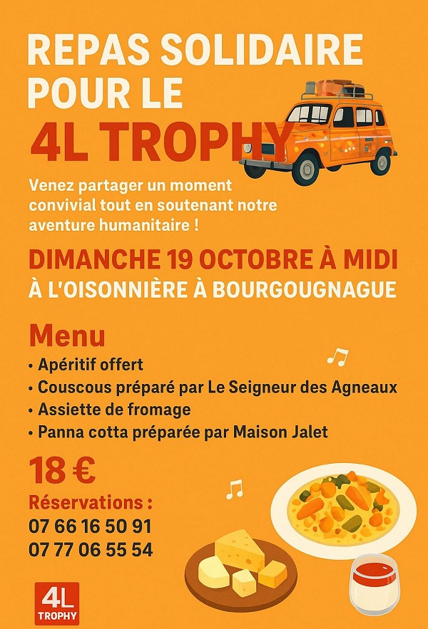 L'association Les Alouettes en 4L vous invite à venir partager un moment convivial tout en soutenant leur aventure humanitaire. Au menu de ce repas solidaire : apéritif, couscous, assiette de fromage et panna cotta. Sur réservation.