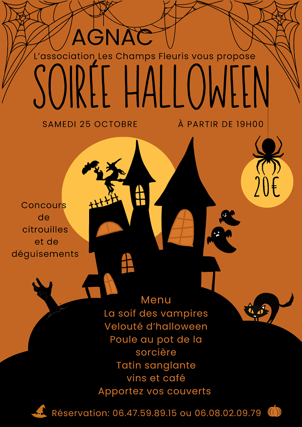 Venez nombreux à la soirée halloween organisée par l'association Les Champs Fleuris. Apportez vos couverts complets et pensez à réserver. Au menu : la soif des vampires, velouté d'halloween, poule au pot de la sorcière, tatin sanglante, vin et café. Concours de citrouille et de déguisements.